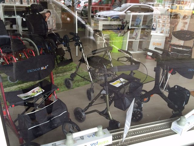 彼女から写真が届きました。『週末に行っているスーパーの近くのお店を覗いてみたところ、歩行補助車が数種類展示してありました。思わず写真を撮ったので送ります(外からとったので見にくくて済みません)。』