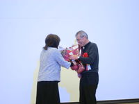 学生に人気の高い先生であり、当日も在校生・卒業生がたくさん花束を抱えて最終講義を聴きに来ていました。私もホコケンを代表して花束を受けとっていただきました(この時のお花は現在、研究室の前で咲き誇っています)。