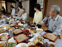 ホコケンメンバー手作りの昼食会でした。メニューは、鏡森顧問の薬膳粥フルコース、梶さんと水口さんの手打ちそば、八十島会長さんが採取された山菜の天ぷら、そのほかメンバー持ち寄りの手料理。新緑の清々しい風とテーブルいっぱいの料理をすべて平らげ、ちょっと食べ過ぎの感はありますが、満喫・満腹・大満足の1日となりました。途中、つがいの燕が部屋に舞い込むハプニングも。料理をしていただいた方々に大感謝です。
